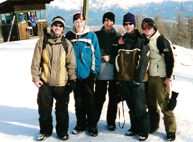 Sam is standing in the middle of this snowboarding group with his school friends.